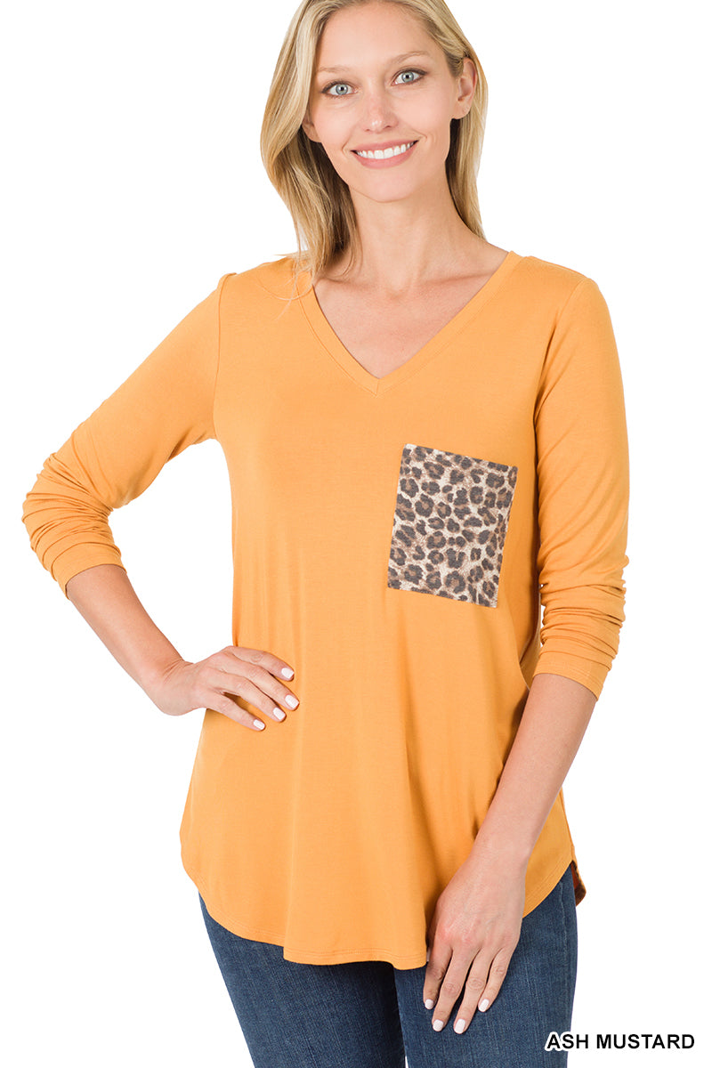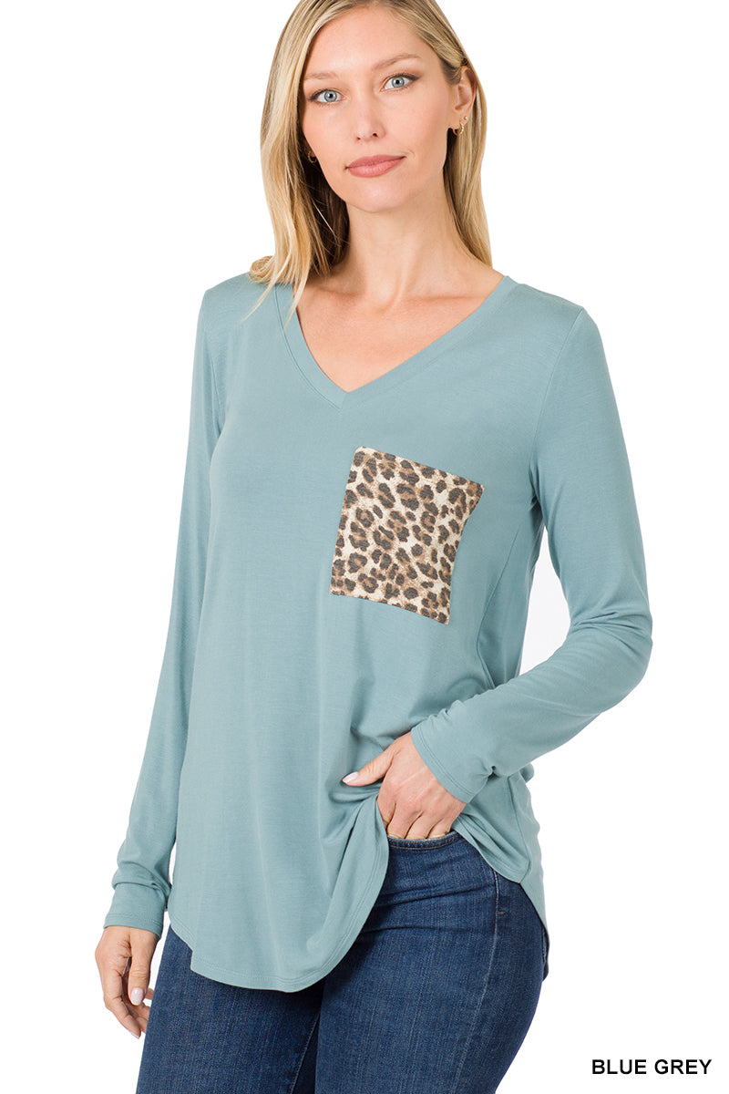 LUXE RAYON LONG SLEEVE V-NECK LEOPARD POCKET TOP