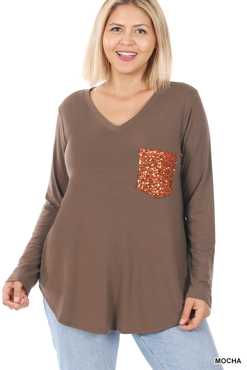 PLUS LONG SLEEVE V-NECK FRONT SEQUIN POCKET TOP